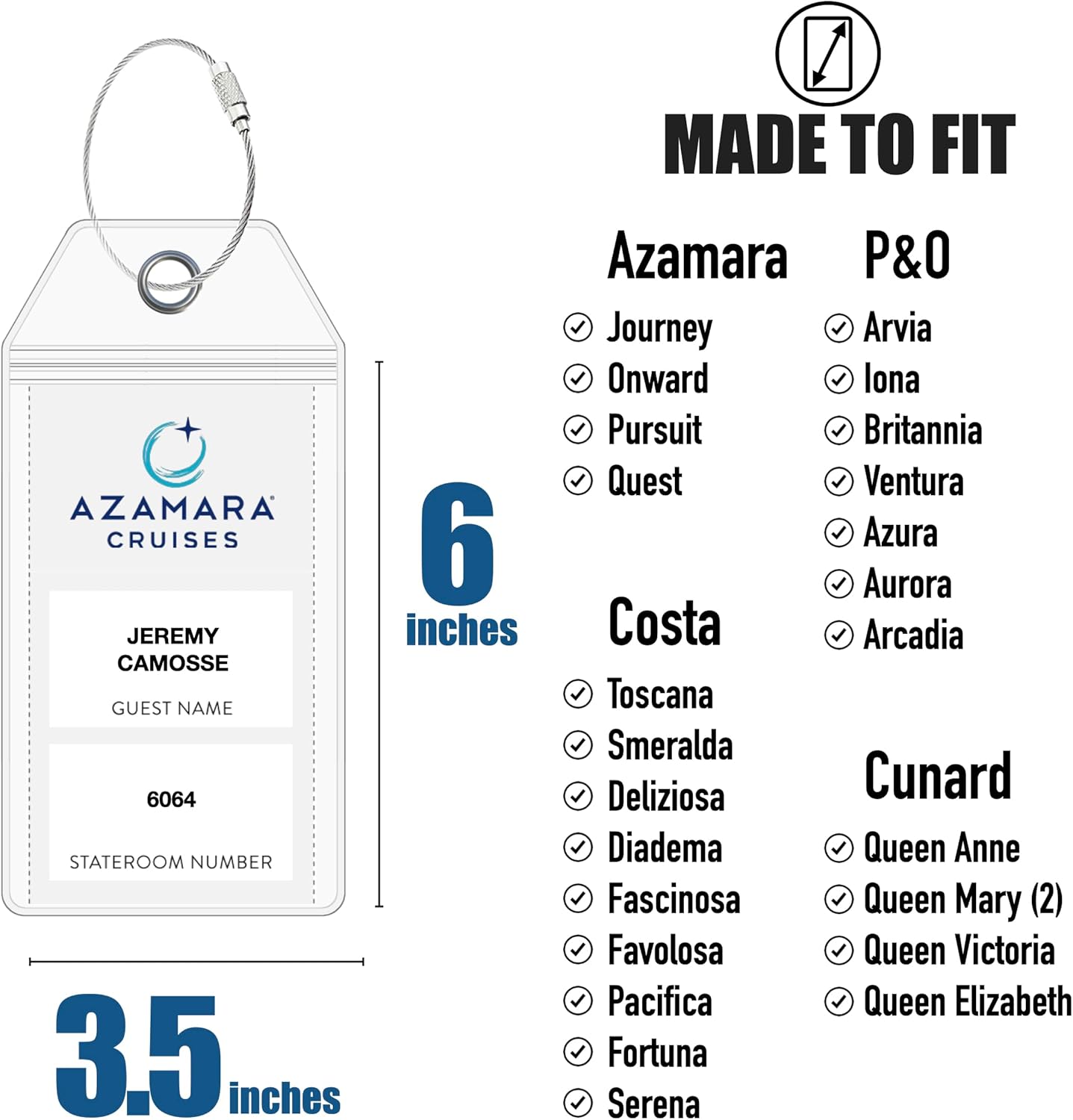 - FITTED: These were updated in 2026 to fit all Azamara Cruise Issued Luggage Tags. Measuring 6 inches in height and 3.5 inches in length, you'll find these perfectly hug your issued docs.